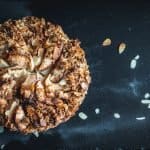 In another bowl or measuring cup, mix the oats, ginger, cinnamon, honey, and olive oil together. Add the almond slices and stir again. Sprinkle the crumble around the edges of the pie, working towards the center.