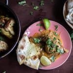 Lay the chicken pieces in the hot pan, skin side down and add the chopped cilantro stems. Let them cook for about 5-8 minutes, letting the skin brown before turning them over. Pour the coconut milk into the pan and stir to pull up any sticky bits from the bottom of the pan and mix the coconut milk with the seasoning. Turn the chicken over in the pan a couple of times so that all sides are coated. Cover and turn the head down to medium-low to simmer for about 20 minutes.